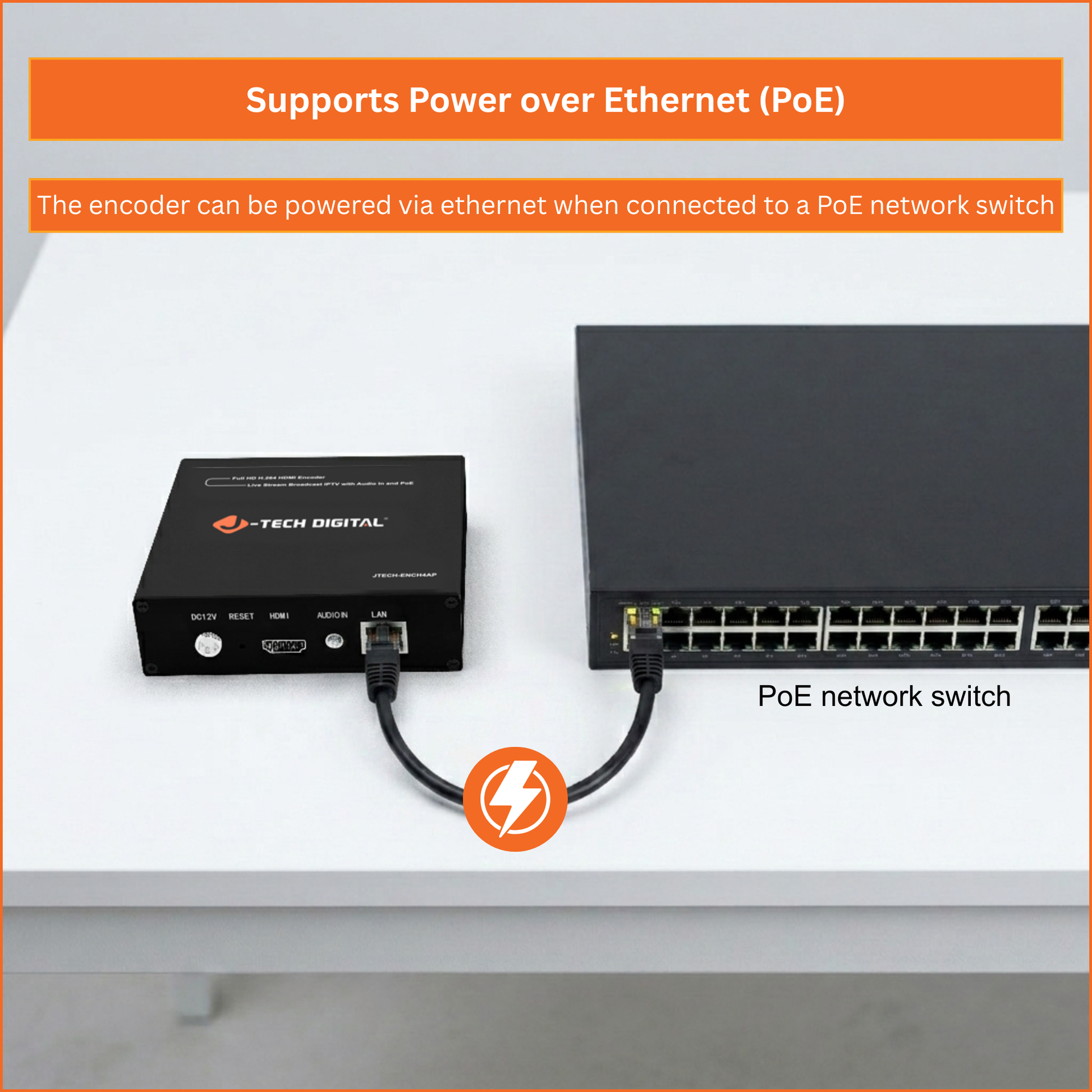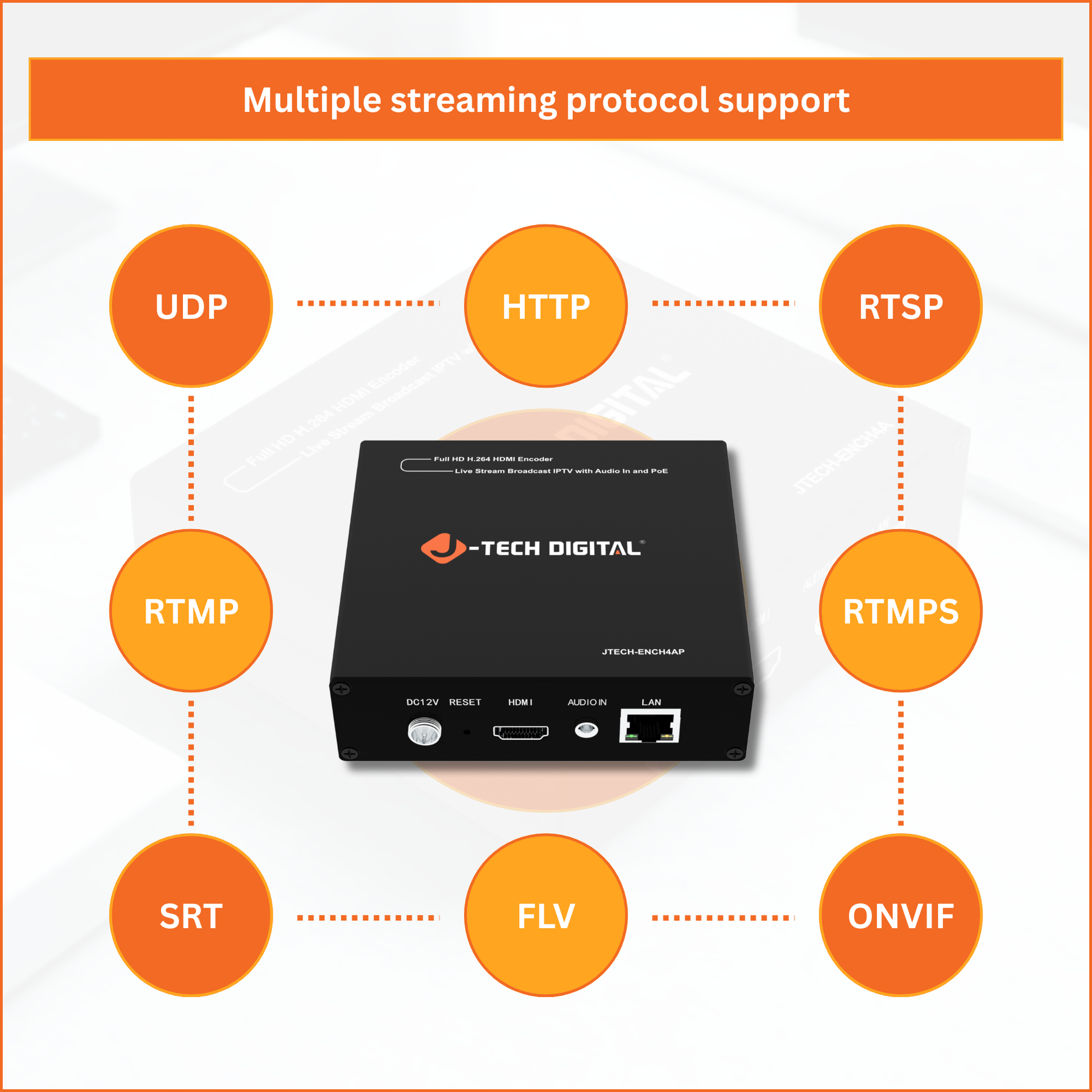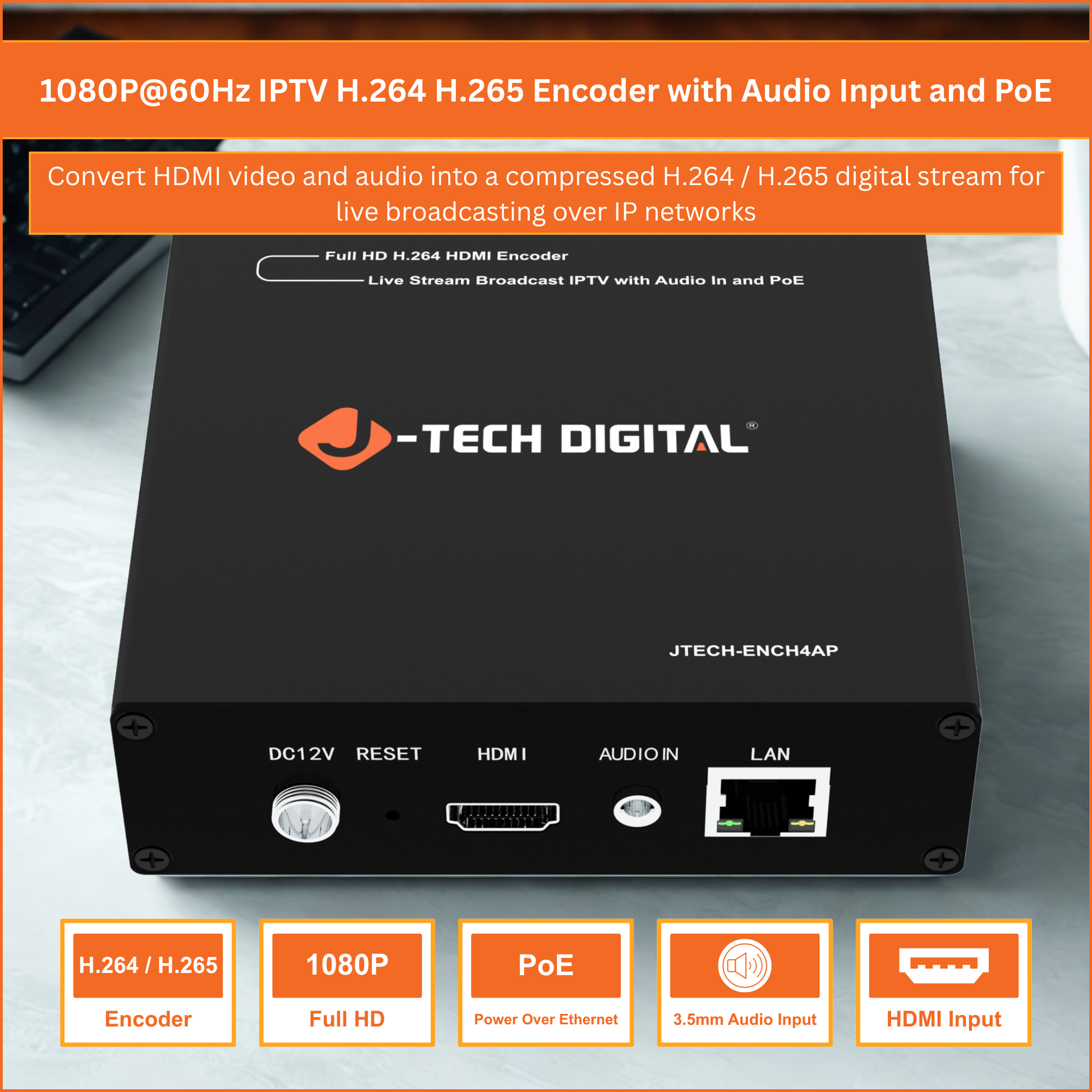 The J-Tech Digital JTECH-ENCH4AP HDMI encoder is a versatile solution for IPTV streaming and live broadcasting. It supports H.264, H.265, and MJPEG compression to deliver efficient bandwidth usage and high-quality video, along with compatibility for RTSP, RTP, RTMP, RTMPS, HTTP, UDP, TS, and ONVIF protocols for flexible network integration. The unit features HDMI input with 3.5mm analog audio embedding for synchronized audio and video, making it ideal for live events, churches, and professional AV setups. Stream in full HD 1080p at 60Hz to up to four platforms simultaneously using one main stream and three substreams. Customizable OSD, logo overlay, and a no signal image allow for a fully branded and professional viewing experience. With Power over Ethernet support, installation is simple and efficient using a single cable for both power and data, requiring a PoE network switch.
